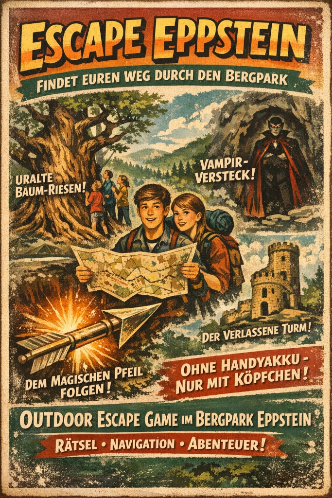 Du bist in einem verwunschenen Bergpark - aber der Handyakku hat versagt! Wie findest du hier ohne technische Hilfsmittel wieder raus? Ein magischer Pfeil aus Metall zeigt dir die richtige Richtung! Und mit einer geheimen Landkarte entdeckst du uralte Baum-Riesen, ein Vampir-Versteck und den verlassen Turm eines reichen Edelmannes.Bei diesem Outdoor Escape Workshop löst du im Team Rätsel, lernst viel über Navigation und findest so deinen Weg durch den verwunschenen Bergpark Eppstein.